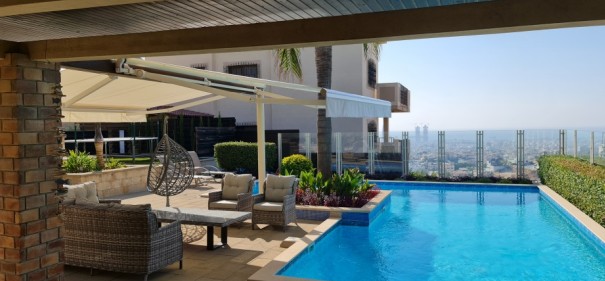 Magnificent 5 bedroom house is of a postmodern signature architectural style, with real luxury level finishes and a total covered areas of 750 sq.m., consisting of the following facilities. Main bedroom bathroom with double Jacuzzi, walk in shower, toilet room. 2 large Living room areas with a big traditional marble fireplace and high ceilings. 1 office with built in library shelves, large playroom/cinema room. Large gym area with a storage room. Covered garage with a remote control door for 3 cars. A Beautiful garden with a large swimming pool. Large covered barbeque area with fridge, sink, storage, dining table for 12 people.