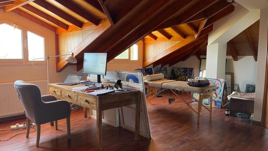 There is also a storage room. Flooring - parquet. The third floor - the space under the roof, the size is 60 sq.m, currently used as an office, easily can be converted to an extra bedroom. Floors - laminate. All rooms are equipped with air conditioning cold/heat. All windows have electric shutters. All rooms are scattered over a lovely hillside, offering spectacular sea, mountain, and city views. The house is equipped with diesel central heating. The villa has a high-speed fiber internet connection.