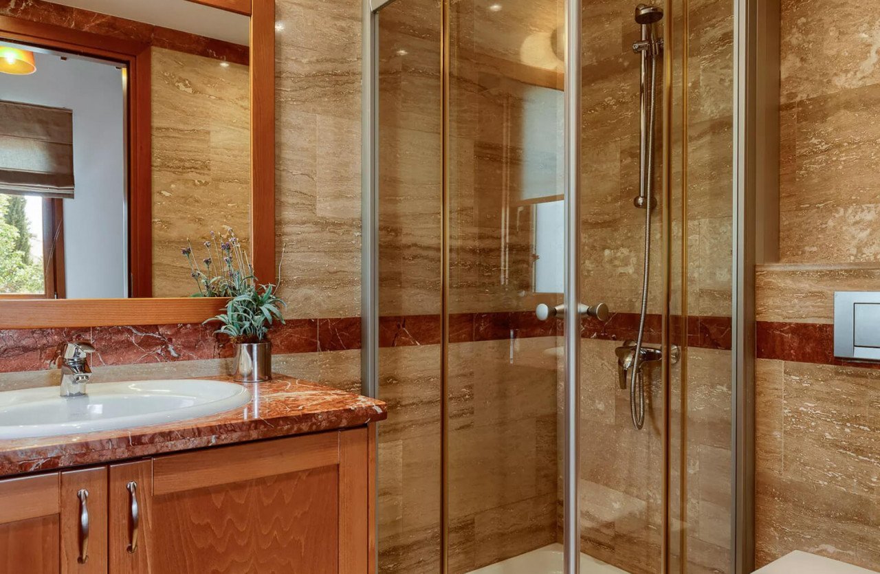 Leading off the lounge, a double bedroom with fitted wardrobes and large chest of drawers and an en suite shower conveniently located on the same floor, offers direct access to the outdoor pool area.
