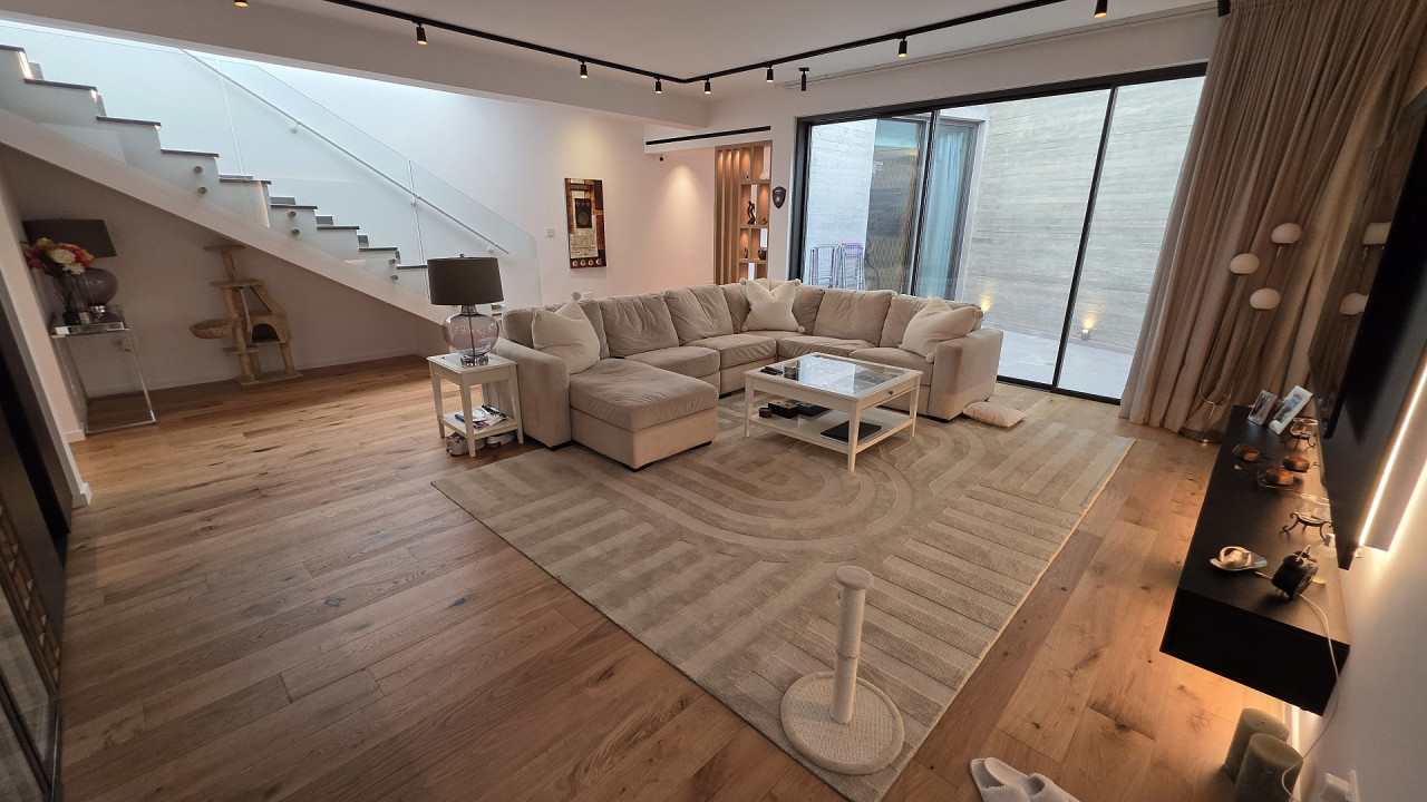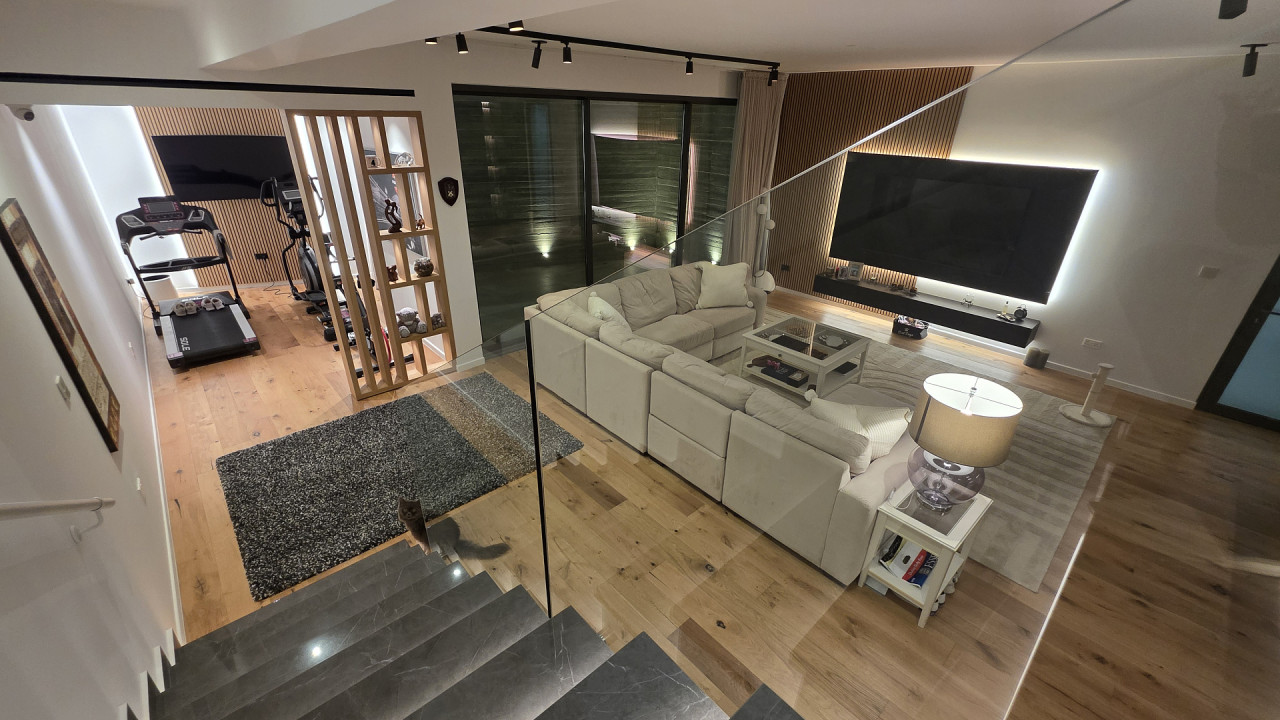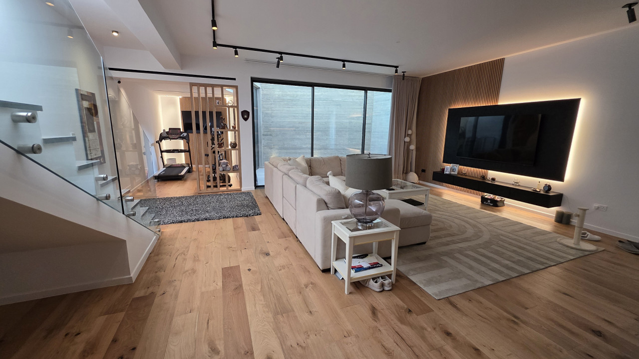 The ground floor includes a spacious open-plan living room and kitchen with access to a large veranda and the pool area, along with three bedrooms.