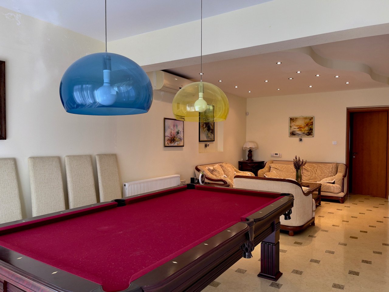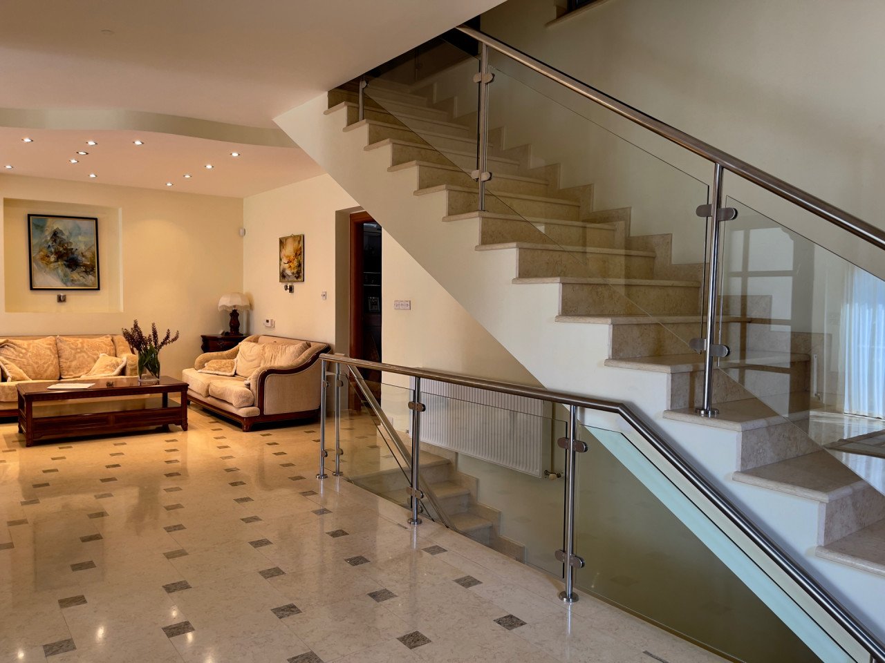 In the basement - there are 2 bedrooms with bathrooms, a sauna with a lounge and a small pool, a garage for 2 cars and a room for staff. On the first floor there is a large separated liv-ing room, kitchen, children’s room, study and guest toilet. On the second floor there are 3 bed-rooms with bathrooms.