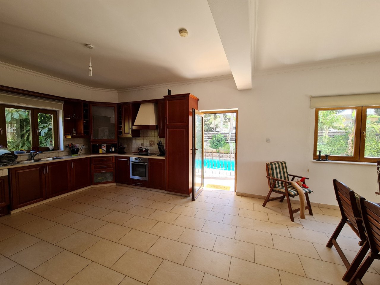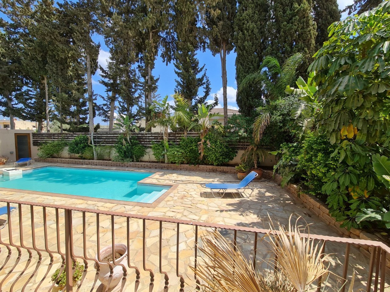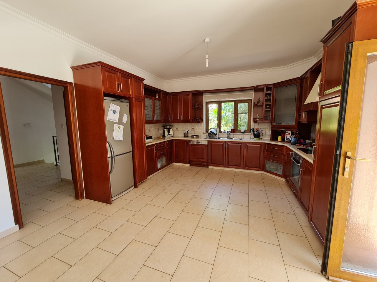 This spacious 5-bedroom villa is located in Deryneia area, in a quiet neighborhood. Firstly, the villa has a huge plot of 653sqm and an internal covered space of 300sqm with an additional 160sqm basement area! So, the house is ideal for people who would love to have a large area with open space. It consists of 4 bedrooms on the 1st floor, 1 of which is an ensuite and a toilet with a common bathroom, a big fully fitted kitchen on the ground floor, and a really big covered veranda overlooking the pool area and garden, where you can enjoy your coffee and just relax. In the basement, the villa offers a separate fully fitted kitchen, open plan living area and dining area, an extra room for office or maids room, and a shower with a toilet room.