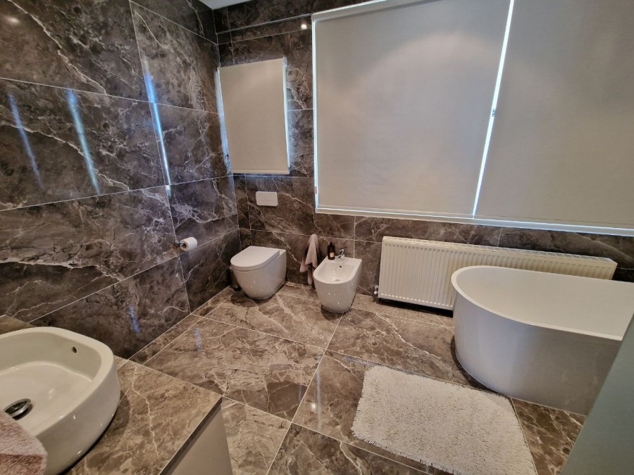 On the ground floor, the villa consists of a large living and dining room, a kitchen with modern electrical appliances and one guest toilet. On the second floor there are 3 spacious bedrooms, each with its own shower and toilet in the main room there is a shower and a bathroom. On the third floor there is a guest room with shower and toilet. In the basement there is a large living room with a breakfast bar, a small kitchen, a bedroom, a bathroom with a toilet and an additional room that can be used as an office or gym. It is built to high standards with energy consumption class A and full thermal insulation, which ensures maximum comfort and efficiency.
