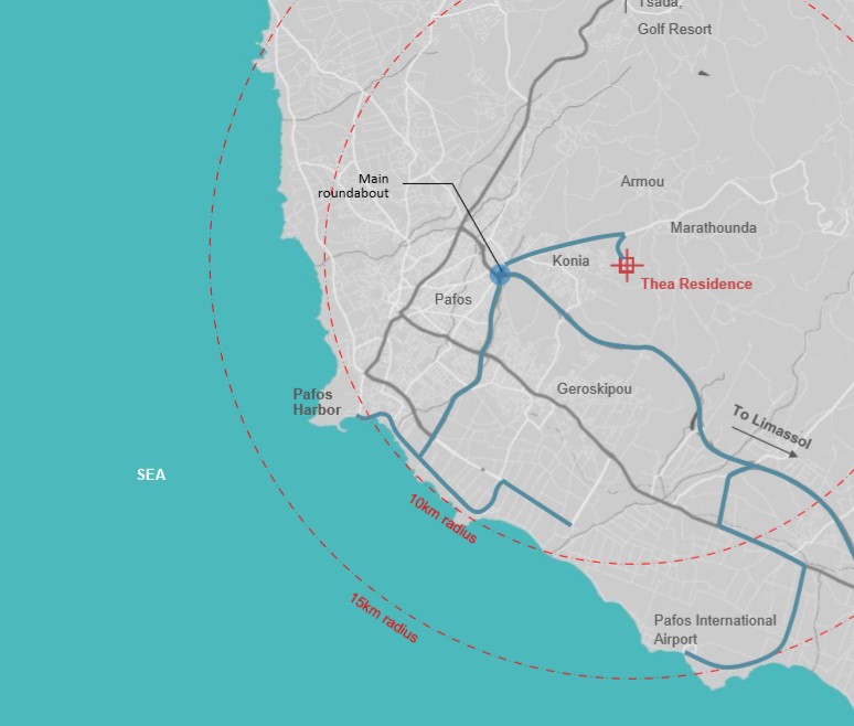 The site sits at a unique location, 330 metres above sea level, and commands panoramic, unobstructed views of the coast that stretch from Pafos Airport (to the south-east) to Coral bay (to the west) and Tsada mountains to the north. The location enjoys a cooler microclimate than coastal Pafos with reduced humidity levels, due to its altitude and its natural environment. Despite its proximity to Pafos (a mere 5 minute drive to the town centre), the site enjoys a level of privacy and access to nature that is most often associated with more remote, mountainous locations. The residence is located to the northeast of Konia, and sits at an even higher altitude than the community. The residence enjoys direct and convenient access to neighbouring communities for local amenities such as bakeries, groceries, tavernas, and schools. The location also provides excellent access to the motorway directly from the roundabout at the entrance of Pafos. Therefore it is easy to access the Paphos centre, the General Hospital, and the International Airport. There is a variety of activities to be enjoyed within a 10km radius. It consists of three levels, arranged to work with the topography for easy access, security, and sustainability. Its unique architecture is inspired by the site itself, and follows the architects’ aesthetic and environmental values, to provide for a lifestyle that is at once luxurious and leisurely. The site is configured in such a way as to make the most of the sweeping views over Pafos, and at the same time utilize the topography and gradient to provide convenient and secure access. The placement of the residence allows a large garden to the front, and maintains a large part of the plot to the rear for additional landscaping to create a more private garden.