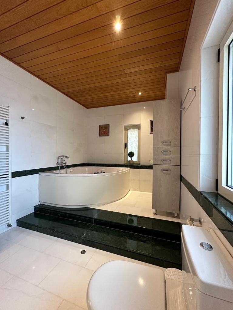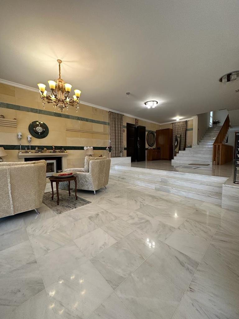 The house has been renovated with no expense spared, using the best materials and luxury finishes, and comes with many extras. It boasts a double garage with electric doors and a covered parking area, and upon entering the house, you'll be greeted by a beautiful marble floor and spacious living areas. The lounge area is large, and there's a separate relaxation area with a fireplace, a separate kitchen, a dining area with the latest appliances and granite worktops, a small lounge area, and a breakfast table. You'll also find a laundry room, a guest cloakroom, and access to the garage area.