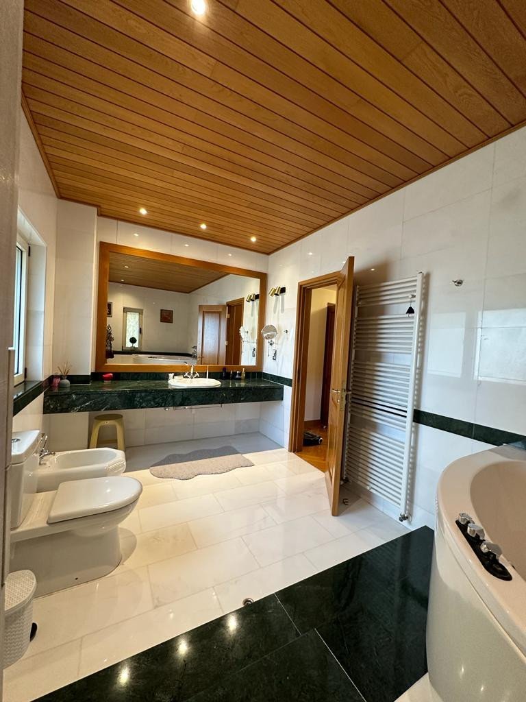 The first floor can be reached via a comfortable staircase, where you'll find a spacious bedroom hall that leads to the four bedrooms. The master bedroom is particularly spacious, offering walk-in wardrobes, en-suite facilities, a jacuzzi bath, and a large balcony with sitting areas and beautiful sea and mountain views. You'll also find a family bathroom with a bath and a shower. One of the four bedrooms is currently being used as a study room.
