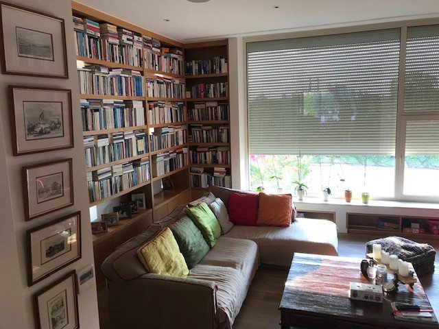Adjacent spacious family room with a big library, a fire place, and a TV mounted on the wall