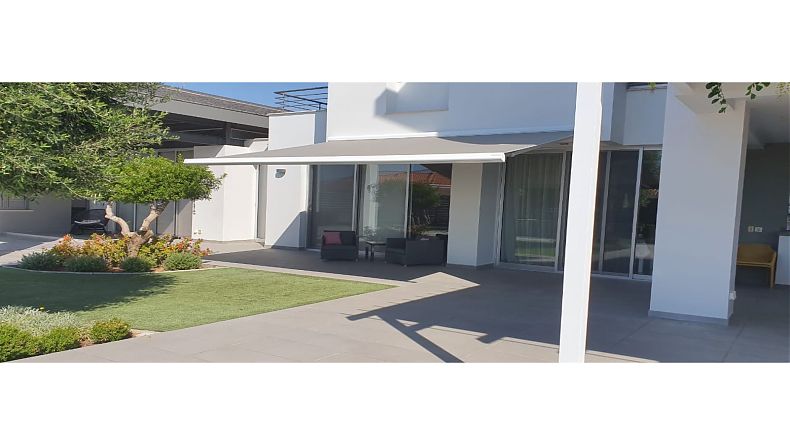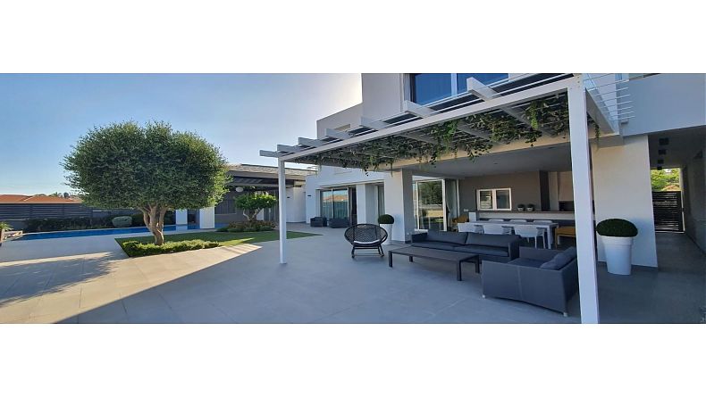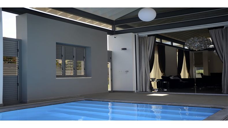 The swimming pool is over flow and it's at the same level of the house and yard. It has a hydraulic cover for safety purposes. The water used is with a salt system and not chlorine. Half of the swimming pool is shaded with the extension of the roof of the living room. Next and below the swimming pool there are three rooms where one of them is an independent room with shower and WC and water jet shower.