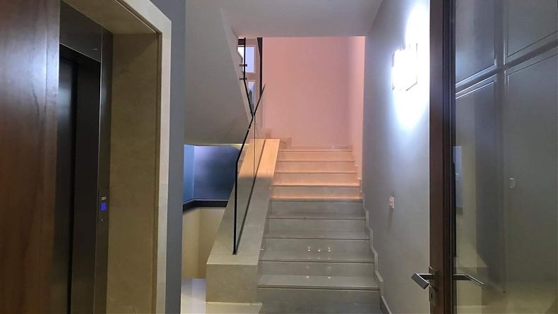 The stairs and bathrooms are covered with marble.