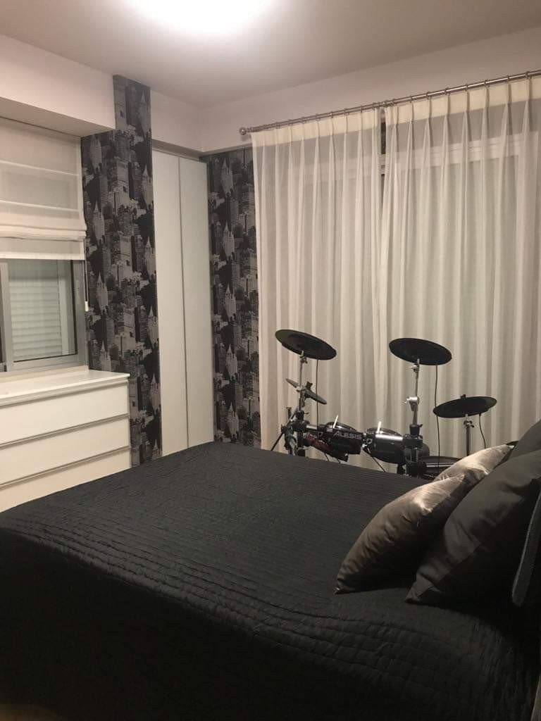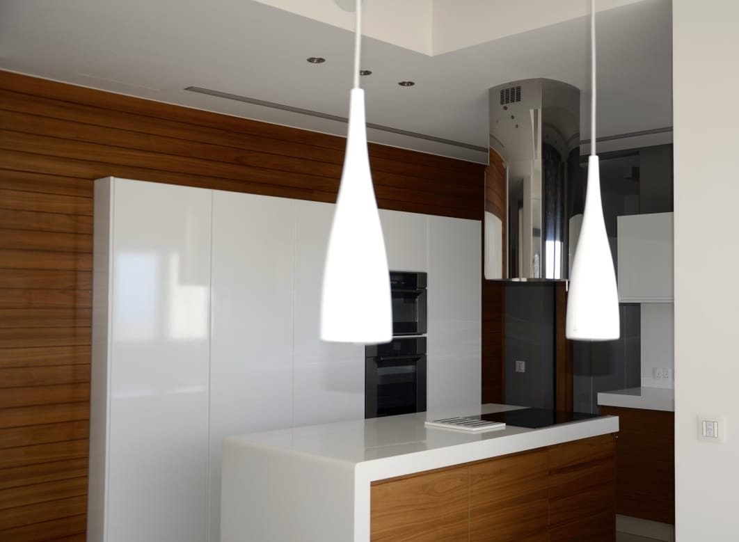 All wooden surfaces, doors, built in furniture and kitchen is made of real walnut wood. The kitchen is also made with Corean – by Dupont materials blended with walnut wood.