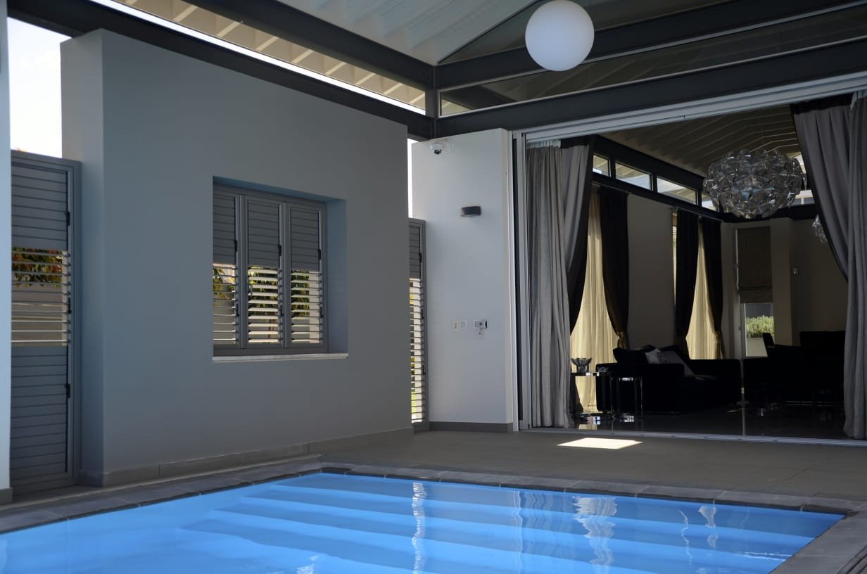 The swimming pool is over flow and it’s at the same level of the house and yard. It has a hydraulic cover for safety purposes. The water used is with a salt system and not chlorine. Half of the swimming pool is shaded with the extension of the roof of the living room. Next and below the swimming pool there are three rooms where one of them is an independent room with shower and WC and water jet shower. There is a storage area for the necessities of the swimming pool and the area where it accommodates the swimming pools engine room.
