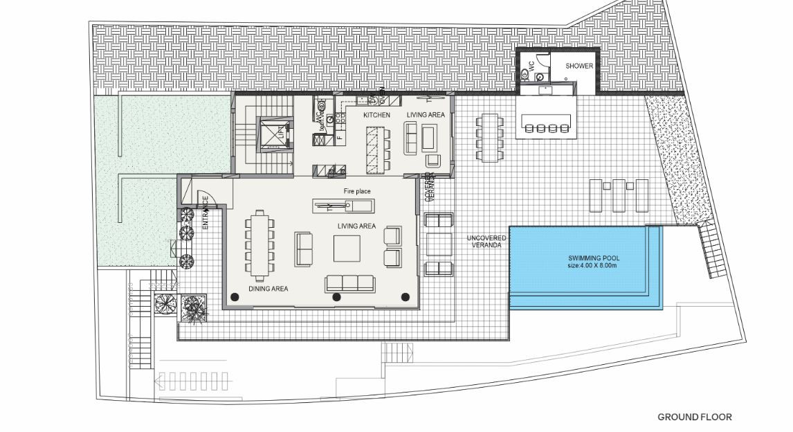 The villa comes with its own private swimming pool, large indoor and outdoor spaces, and covered verandas.