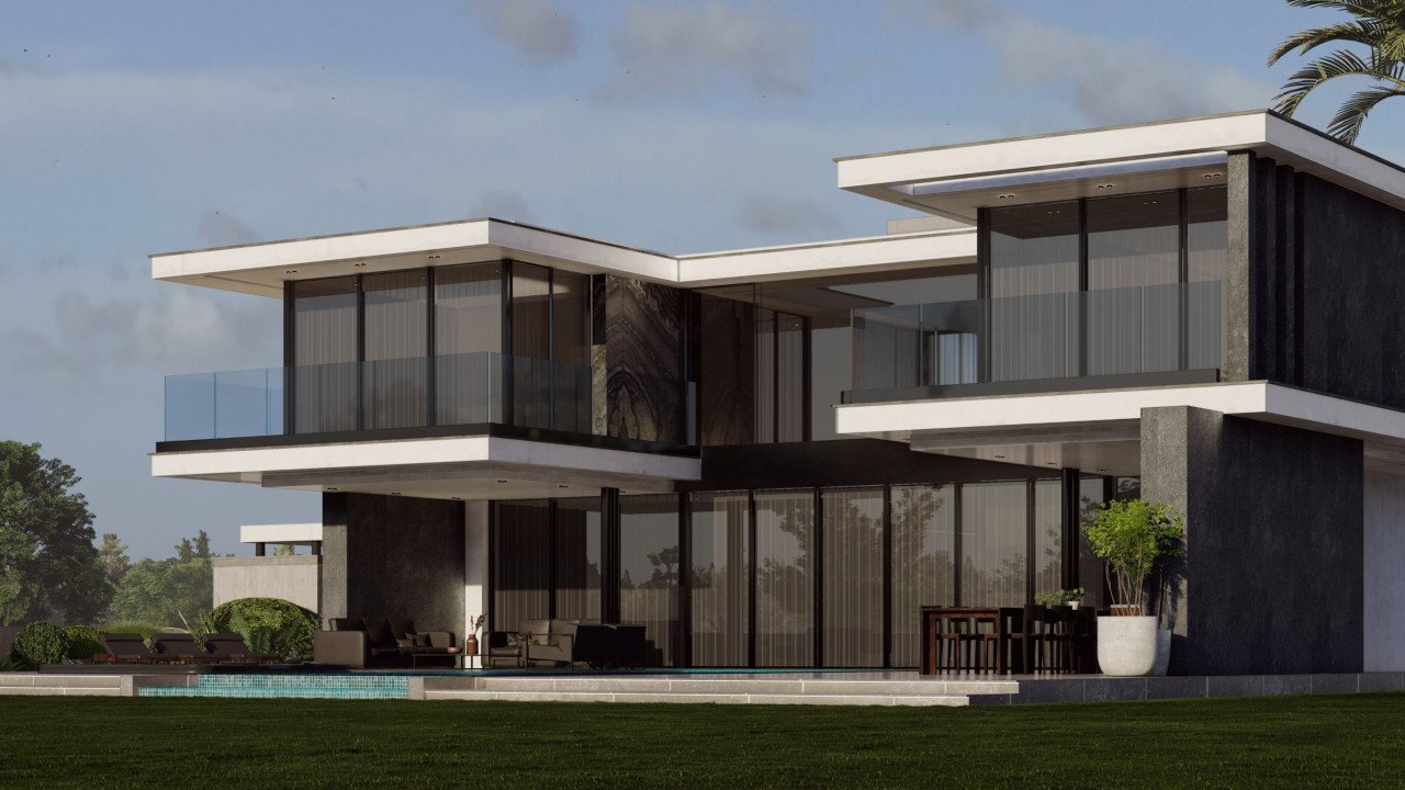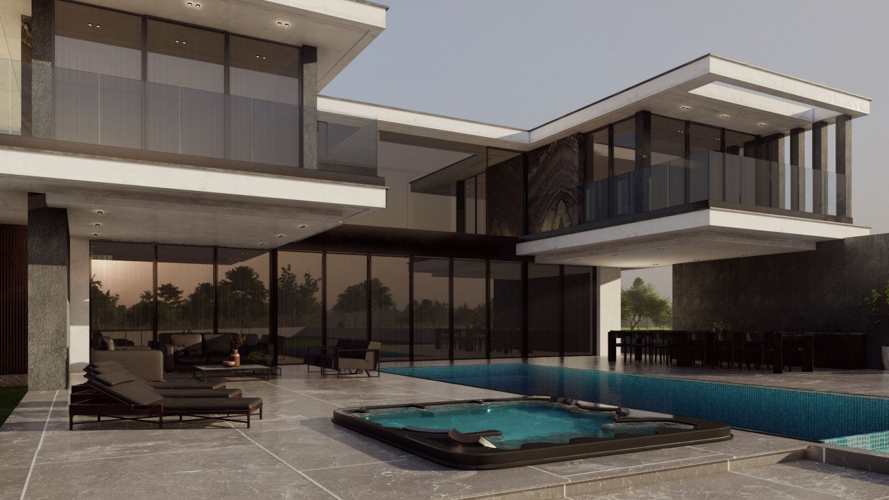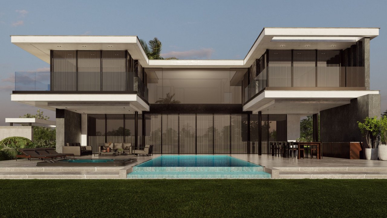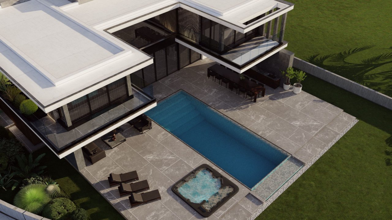 The open-plan layout of the villa creates a perfect flow between the living area, dining room, and modern kitchen with large windows allowing natural light to flood in and providing stunning views of the surrounding area.
