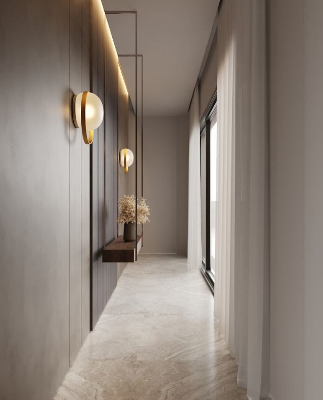 Blend of natural stone, crisp white render, smooth concrete, and aluminum accents