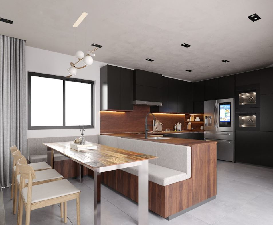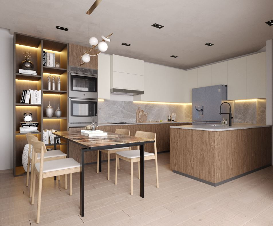 Open-plan living/dining/kitchen area with island and breakfast bar