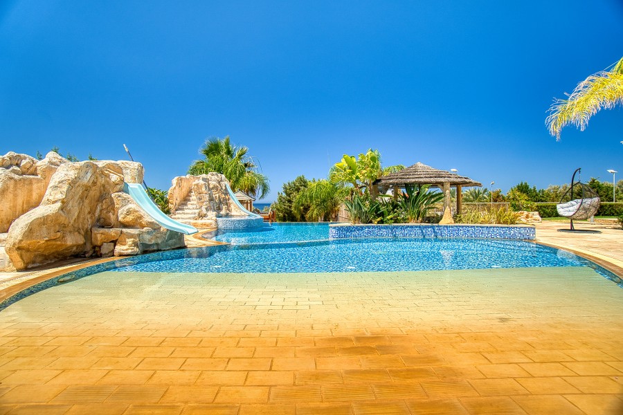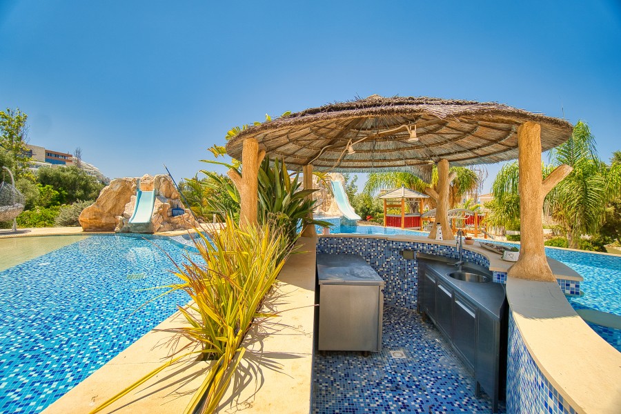 The meticulously landscaped gardens, adorned with natural cut stone, enhance the beauty of the property. The outdoor space also features a BBQ cooking and entertainment center, providing a delightful setting for hosting gatherings. From here, you can overlook the swimming pools and take in the serene surroundings.