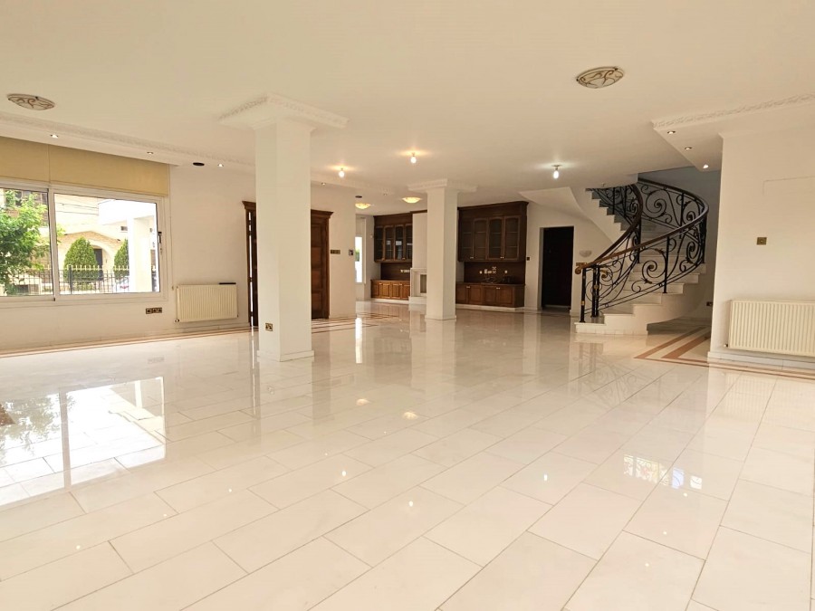 Exclusive 5-bedroom villa located in a very quiet and prime area of Potamos Germasogias. The Villa sits on a huge plot of 746 sqm and has a total of 435 sqm covered areas. On the ground floor, as you enter the double entry doors, you are treated to a vast open living/dining/sitting area. The characteristic of this space is the shiny marble floor made from Thasou marble, a cozy fireplace, and glass doors offering a beautiful view of the garden and pool. There is also a guest WC, a separate kitchen, and a kitchenette. On the first floor, you will find four large bedrooms (one of which is the master room and has its own en-suite bath and WC and also a balcony facing the pool). New parquet flooring has been installed in all 4 rooms. There is also, a family bathroom with a jacuzzi and shower and also a small kitchenette. From this floor, there is a wooden spiral staircase leading up to the enormous loft bedroom which is the size of a small apartment. This bedroom has its own en-suite bath and WC and a storage room. Outdoor features include double electric front gates, a garage for 2 cars with electric doors, a back garden with a pool, and an irrigation system. Separate from the main house there is a self-contained room with its own wardrobe, shower, and WC.