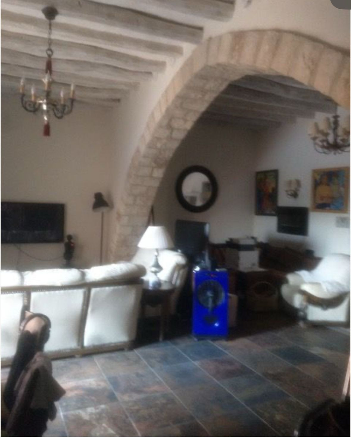 Advantages include the antique hall, one-meter thick stone walls providing unique thermal insulation, a foyer, and a separate kitchen. The house is equipped with underfloor heating, air conditioning, a separate laundry room, and one of the five bedrooms overlooking the pool. There is also potential for solar panels on the flat roof.
