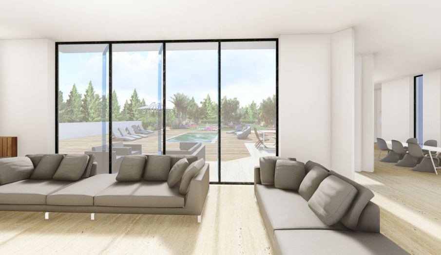 Bright and spacious open plan living room and dining area connecting to the outside area through floor-to-ceiling windows