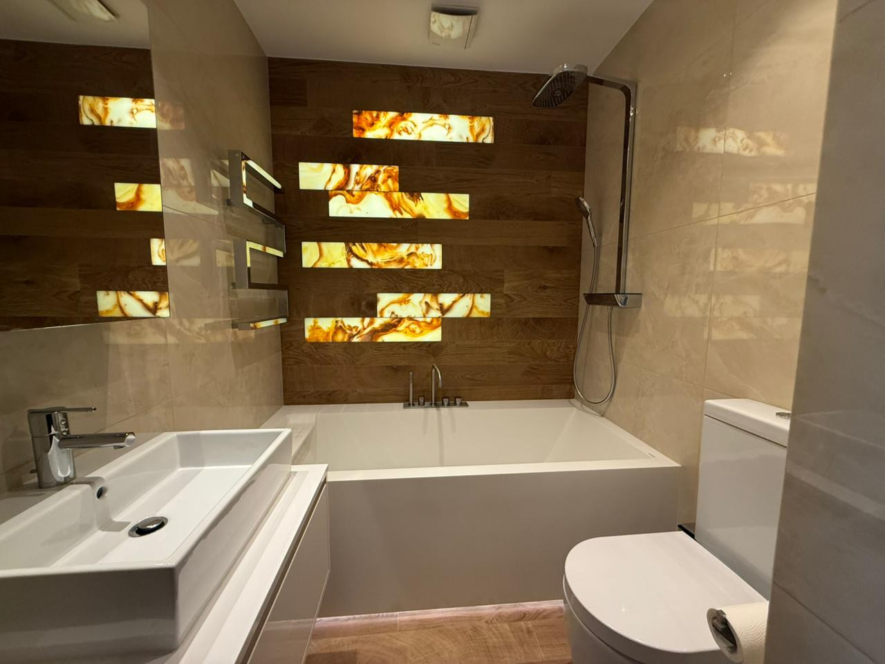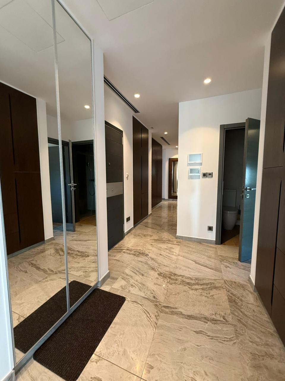 The floors are marble. Floors are heated.