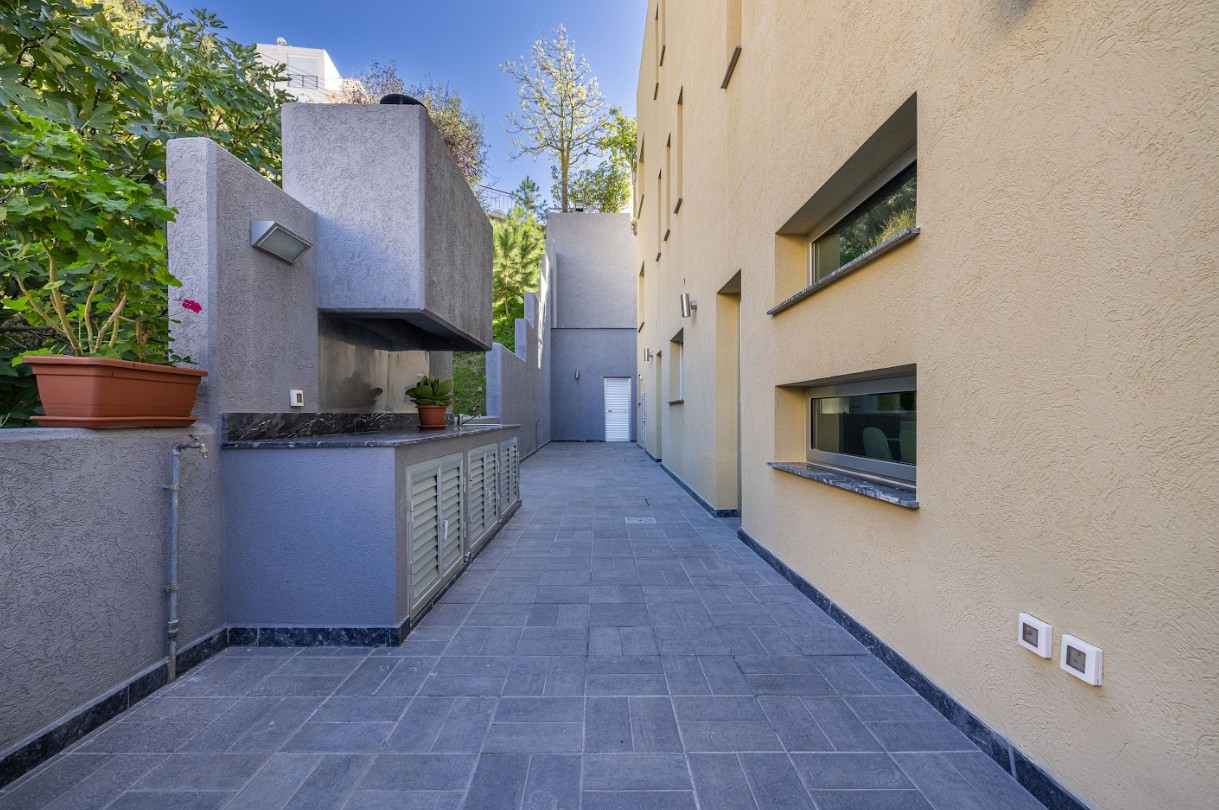 Front: Pool, shower/WC, garden, deck.Back: BBQ area, 3 storage rooms, 2 mechanical rooms.Garage: 3-car (2 covered) with electric gate.