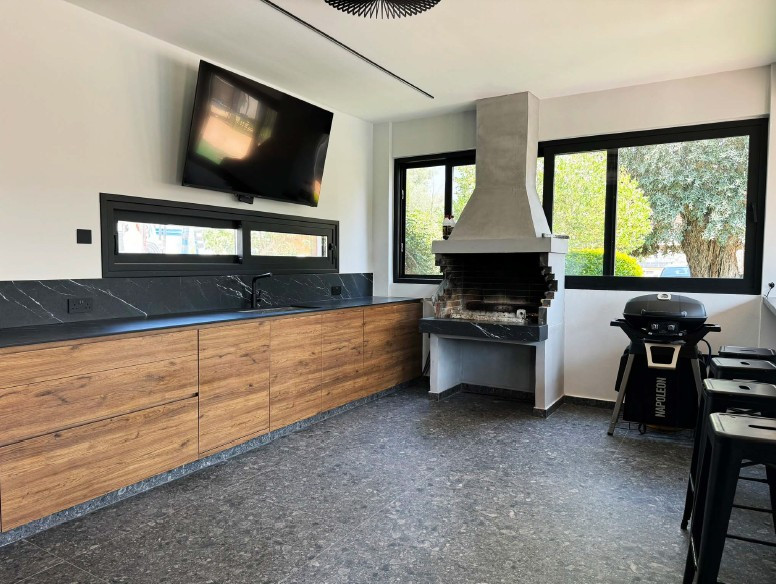 Step outside to enjoy the private swimming pool with mountain, and panoramic views. The property also features an expansive BBQ area with a spacious kitchen, internal shower, and WC - fully renovated in 2023, making it perfect for gatherings and outdoor dining.