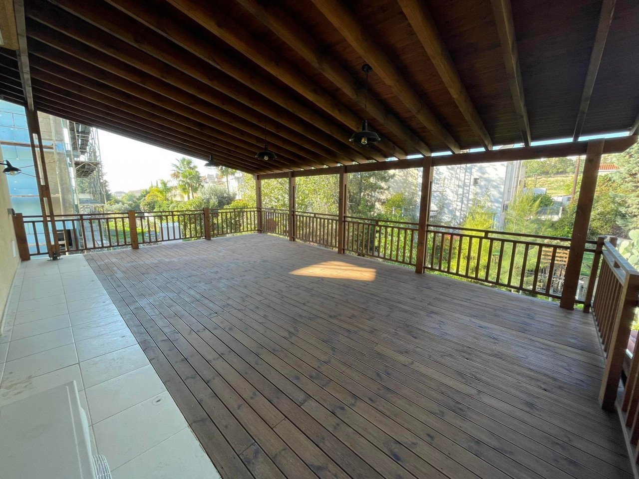 Stepping outside, the lush garden beckons with its verdant foliage and manicured lawns, providing a tranquil retreat amidst nature's embrace. A spacious wooden veranda with a charming pergola awaits in the kitchen area, offering an idyllic setting for alfresco dining or leisurely moments with loved ones.