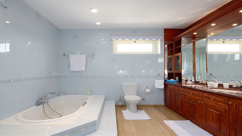 The Master Bedroom has commanding triple aspect views, walk-in dressing room with rosewood wardrobes, and full en-suite (duetta bath, twin wash basins, and hydro-cabin).