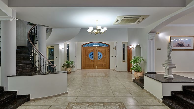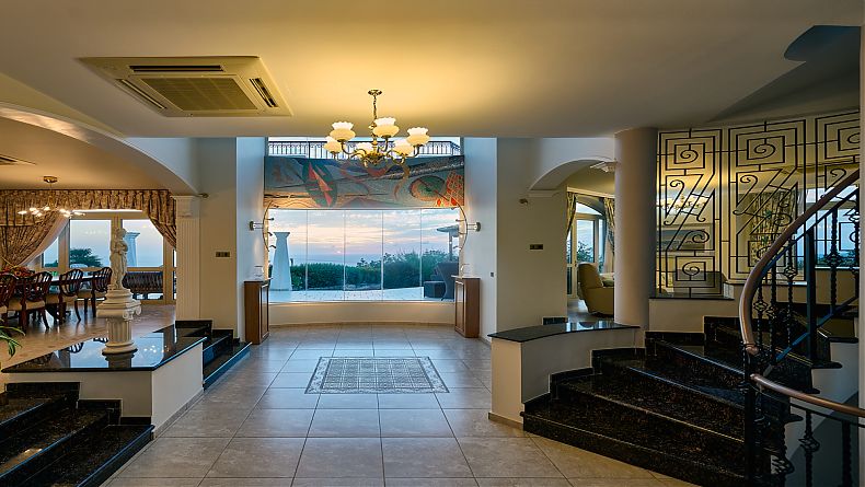 IMPOSING Entrance Hall, 10 metres high with arched ceiling, and full height windows giving views to the coast.
