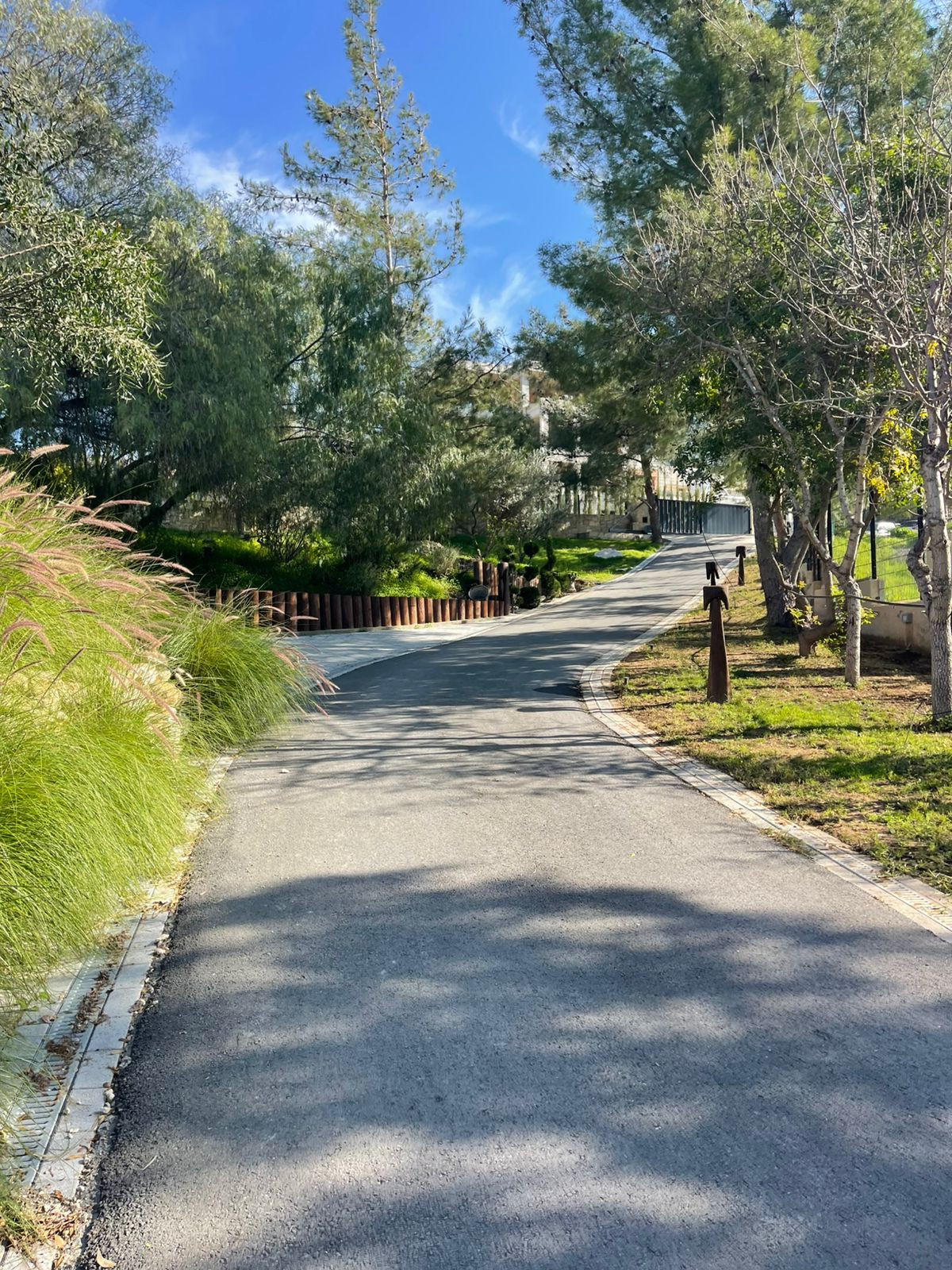 Private driveway leads to the villa, lined by mature trees and passing alongside a semi-dry riverbed