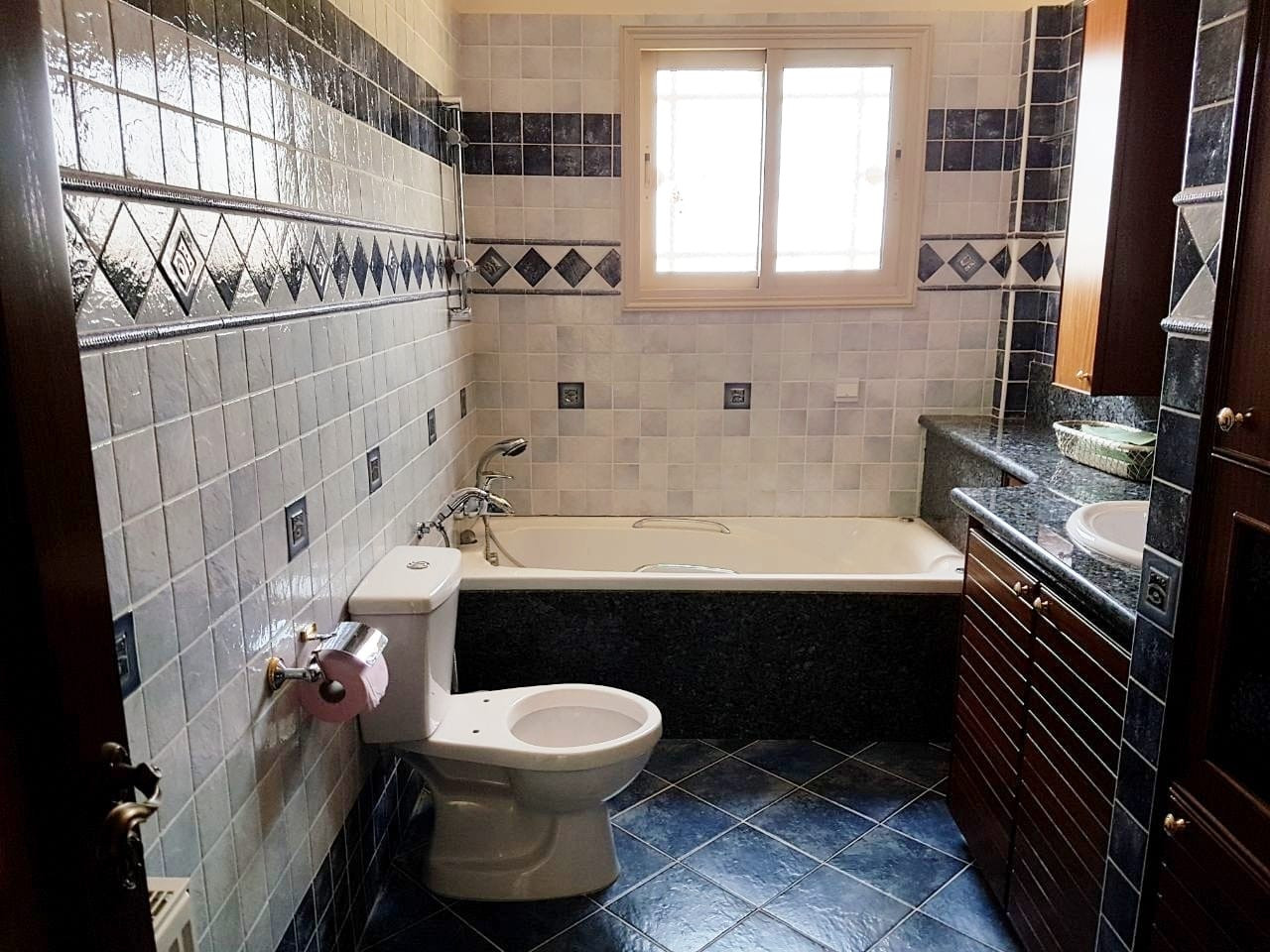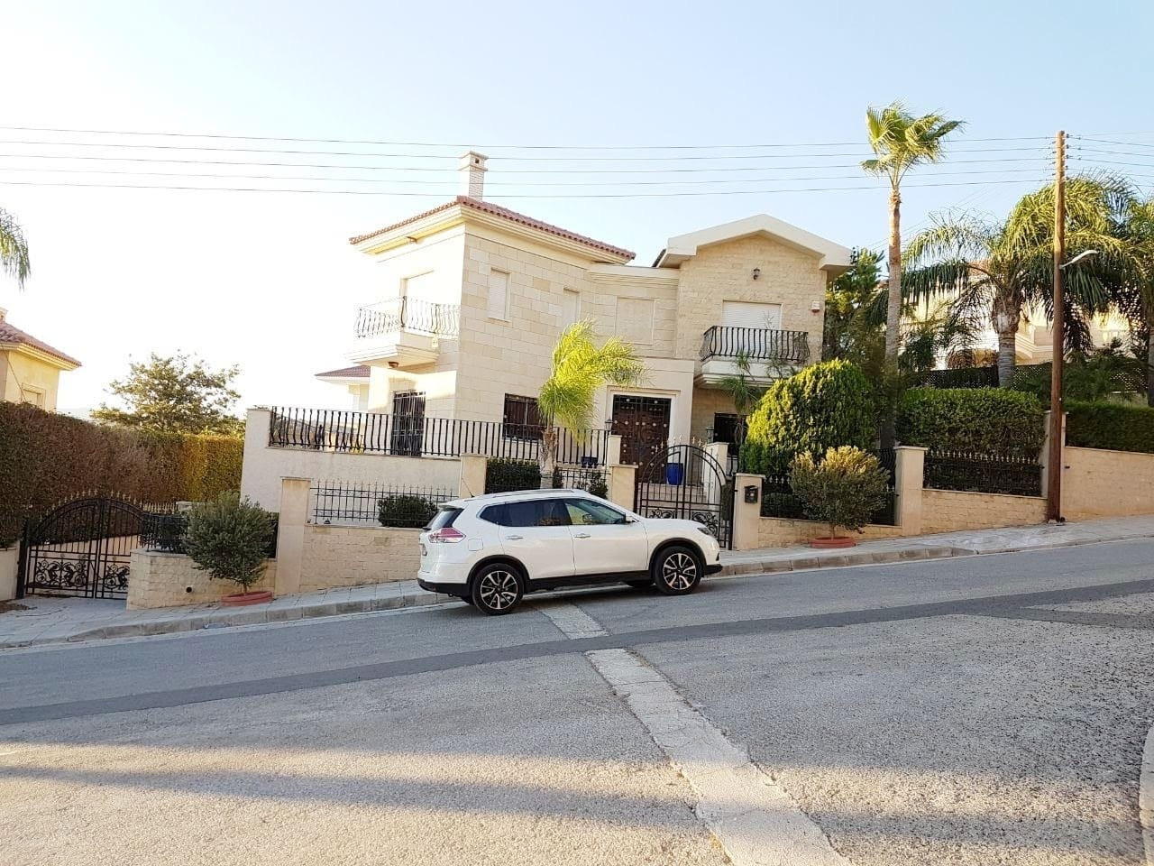 The basement consists of a small kitchen, two bedrooms, one big living room, a bathroom and a Sauna with its private shower. Also available two covered parkings with shutters (garages) and a big uncovered area for more cars. Big garden with mature trees and irrigation system Solar panels for hot water and full diesel central heating Central A/C for the ground floor Extra decorated iron doors on the ground floor.