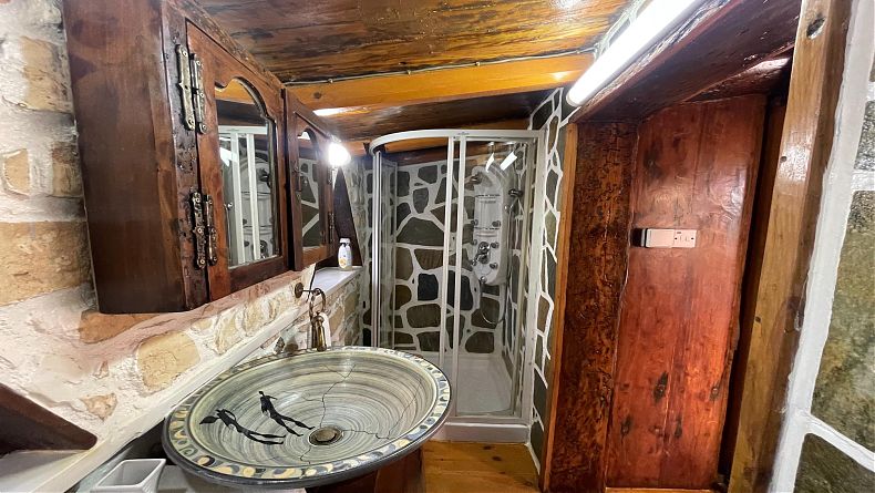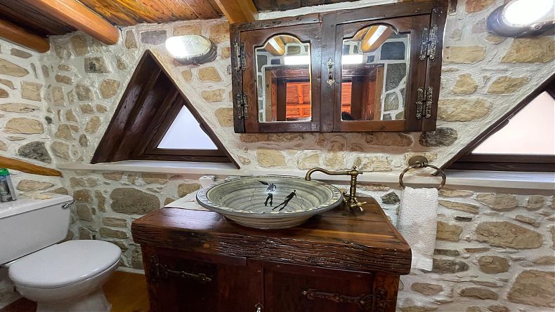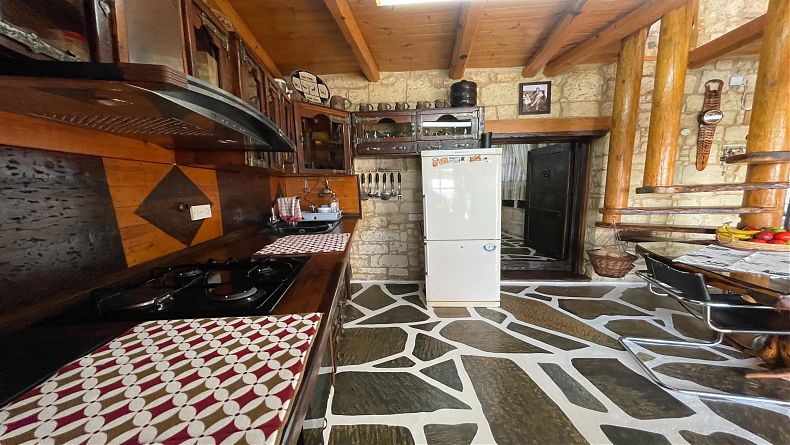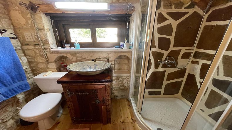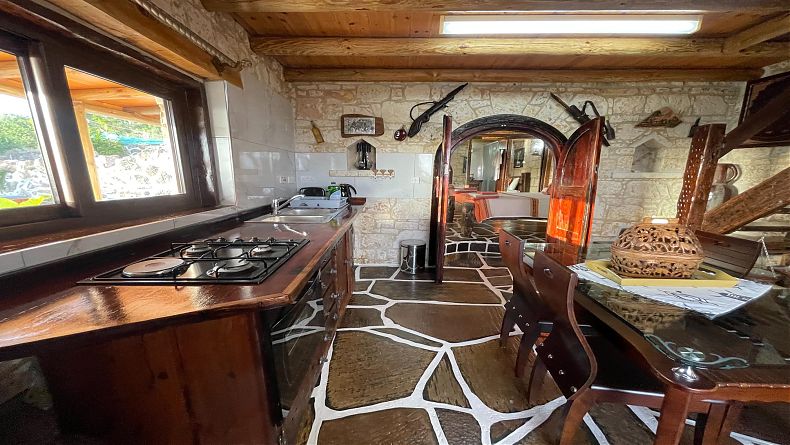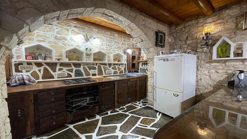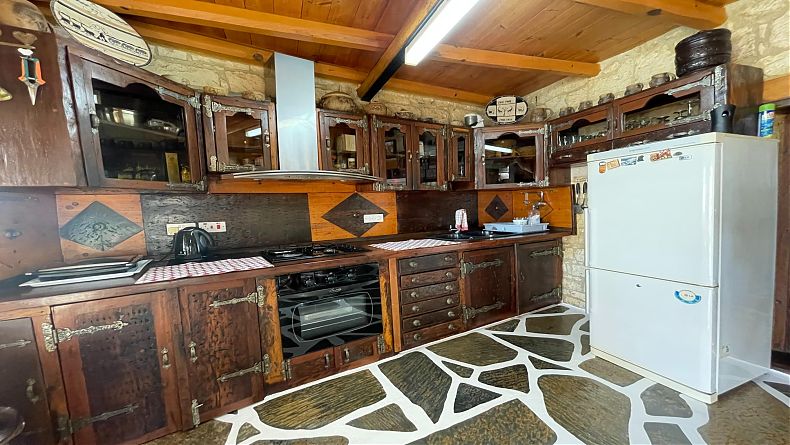 – Ground floor: sitting area with fireplace, kitchen with breakfast bar made from wood and glass. Stone floor.