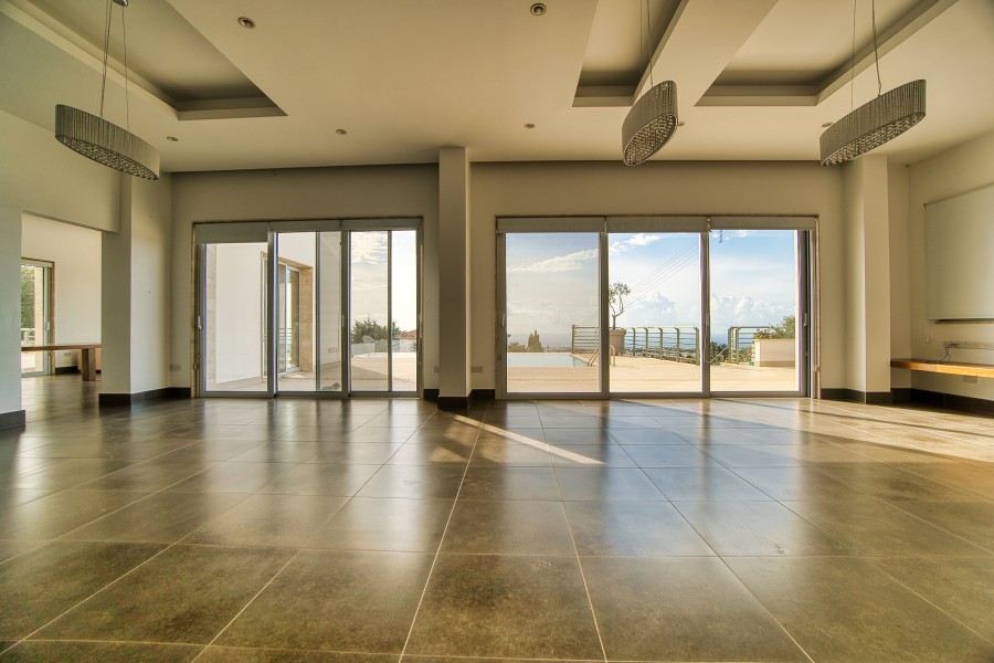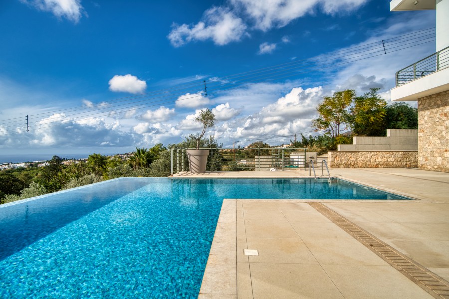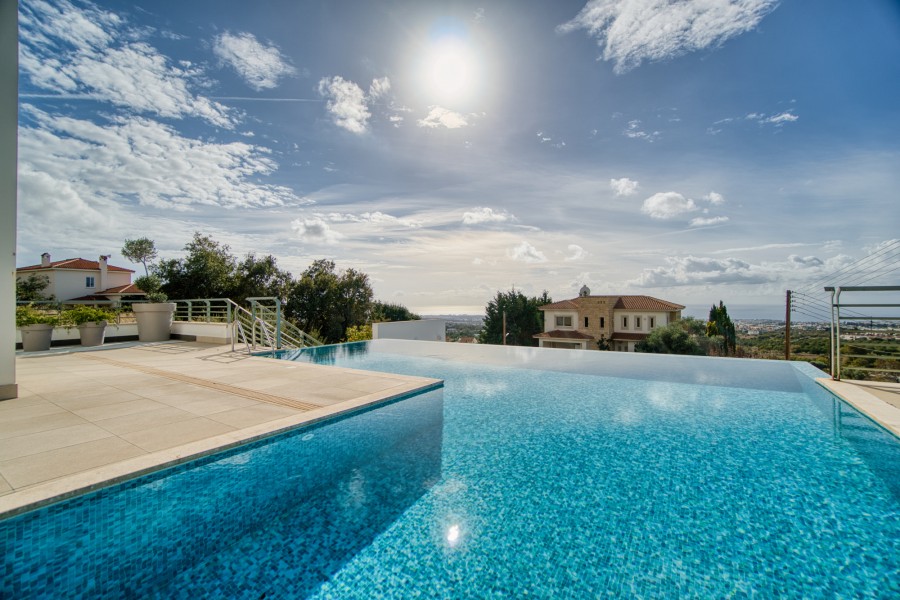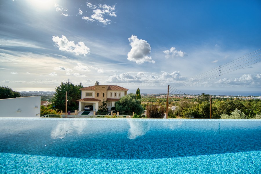 Luxury and beautifully presented eight bedroom villa, set within a charming double aspect plot with stunning views over the Paphos coastline, located , just minutes from Pafos town center and within easy access to the highway. This property offers the unique opportunity of a tranquil and secluded setting, yet is within easy reach of all amenities, the International School of Paphos and the golf club at Tsada. Set on a large plot the property has a private swimming pool surrounded by terraces, gardens and relaxation areas with fantastic views. There is a studio flat in the garden. Close to the bus services and to all the amenities of the village. Mesa Chorio is just 3km from Paphos with breathtaking and elevated sea views. This is a wonderful property for either a holiday home or for those seeking a tranquil hideaway. With an impressive open plan living room, entrance hall and designer kitchen; four light and airy en-suite bedrooms; direct access to a terrace and pool area from the living room which boasts an abundance of impressive views. Luxury touches include under floor heating, a VRV system for cooling, large sun deck by the oversize private pool, private car parking and special designed bathroom futures The well laid out and meticulously maintained garden guarantees privacy and features spacious sized pool terraces and a Bbq area.