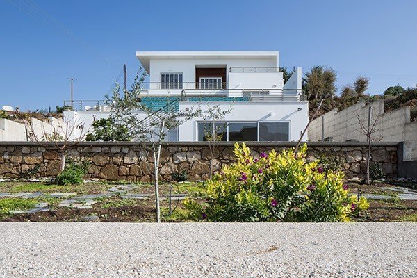 The building features reinforced concrete frame, partial brick wall and flat roof. Part of the exterior masonry is lined with stone and wood. The house is built on levels, with the pool level on the ground floor and the barbeque on the level below the pool. The house has a large garden with fruit trees, roses.