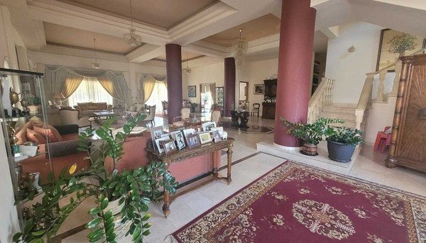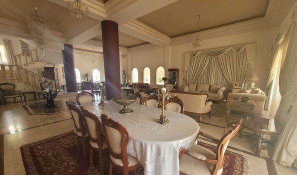 It consists of a living room,a big veranda upstairs, 2 kitchens, maids room, a storage room, library on the ground floor, 6 bathrooms and there are also outside a 2 bedroom service room of 100m2