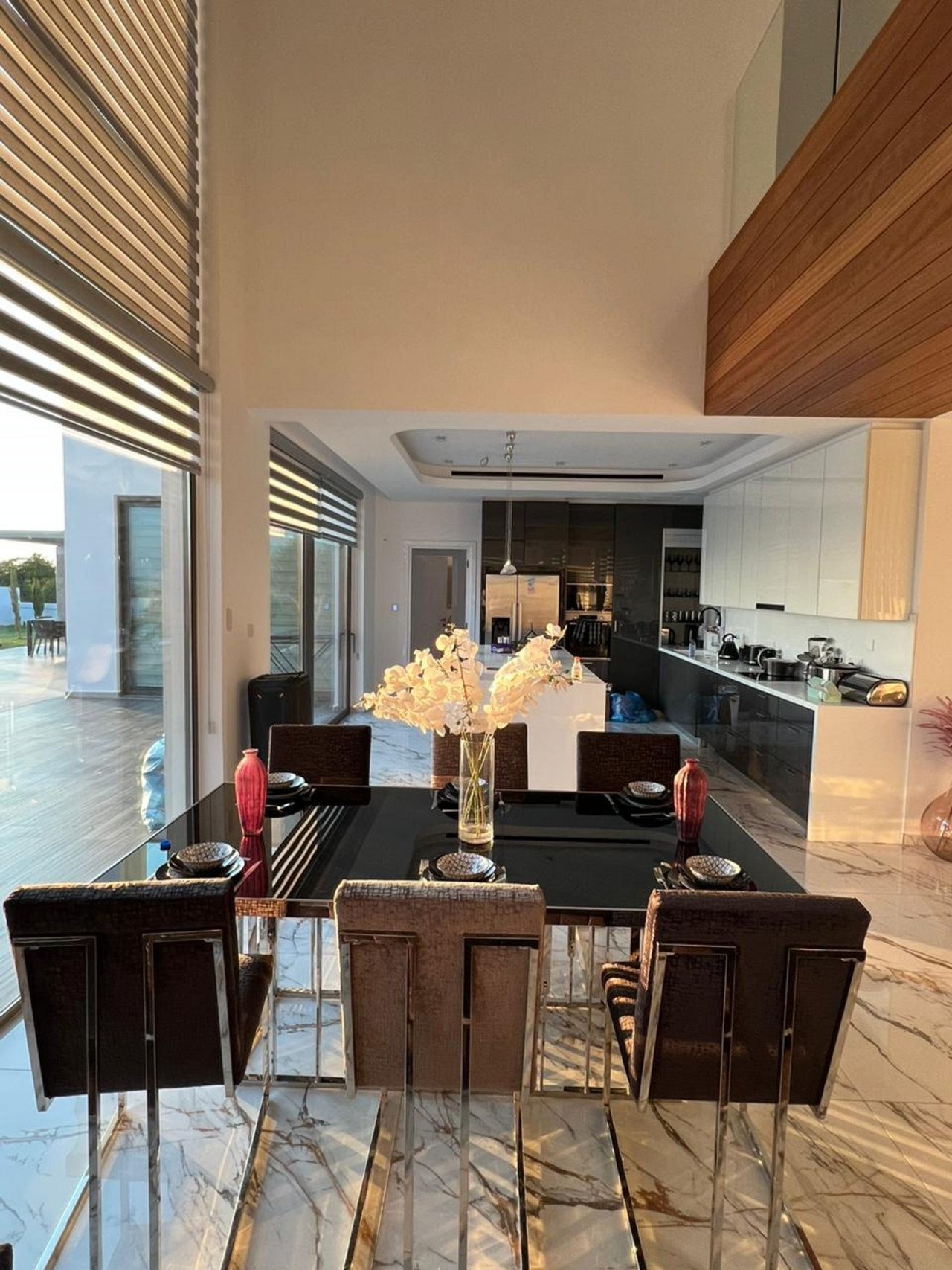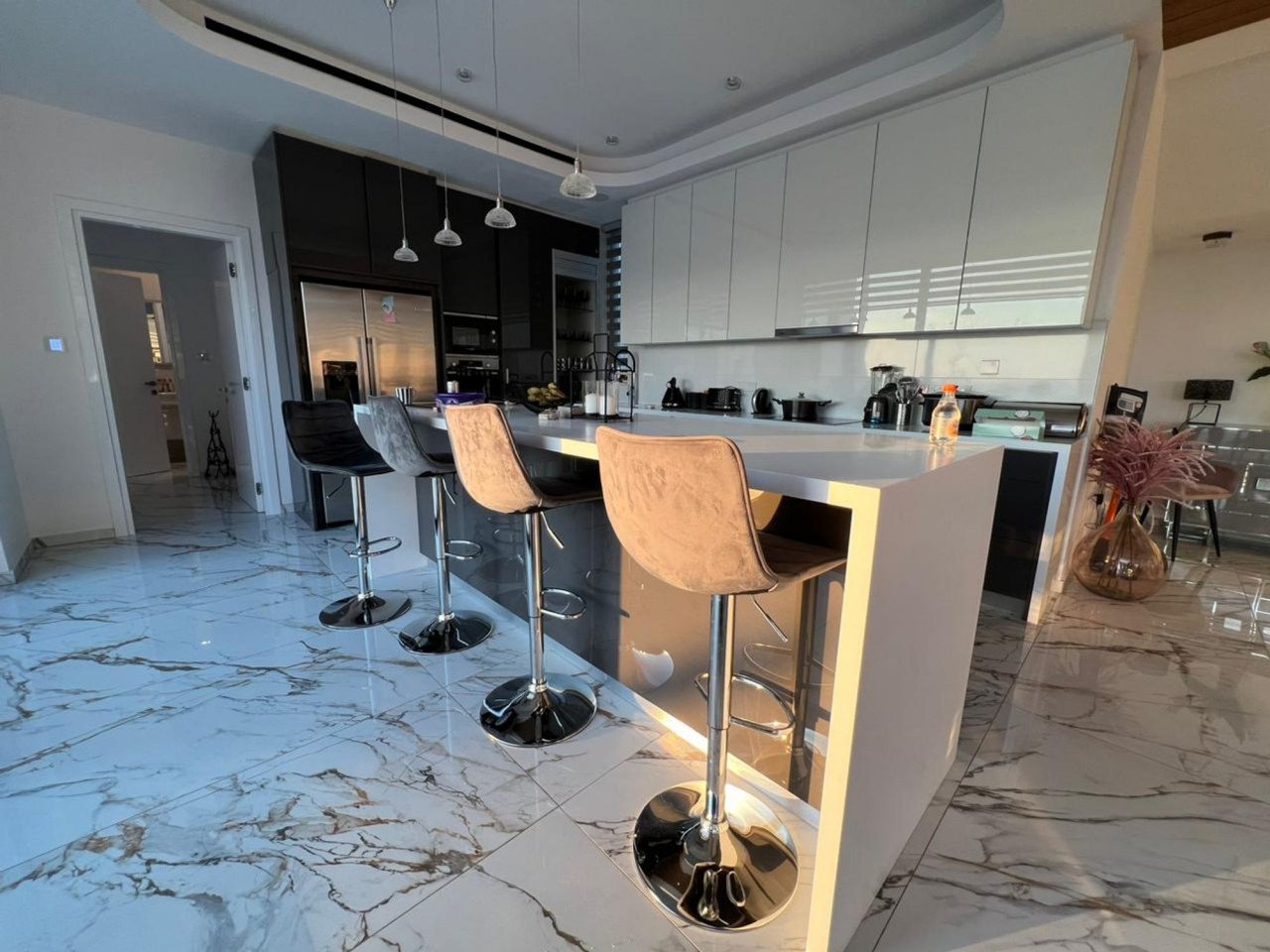 Bespoke fixtures and fittings with 0.90x1.50 floor tiles, corian worktops, marble staircase and glass balustrades.