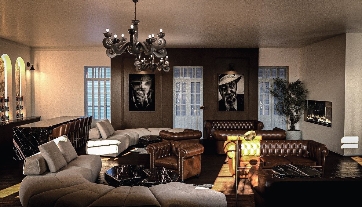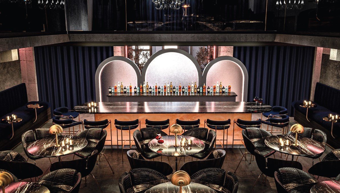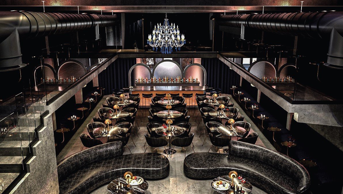 Separate dedicated bar area, stage, balconies for guests, dance floor, men's and women's restrooms, separate fire exit, and a passage to the kitchen for serving food.