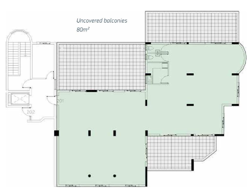 The ground floor consists of seven individual shops a total of 303sq.m and open plan with a mezzanine 165sq.m . The first floor consists of seperate offices on 303sq.m and the second floor is a large 300sq.m open office space