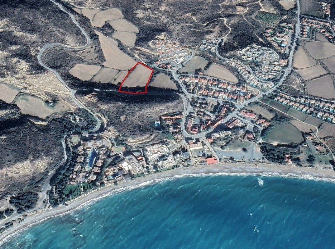 A plot in Pissouri, Limassol. It has an area of 9514 sq.m. It falls into touristic zone with building density 25% and coverage ratio 20%.