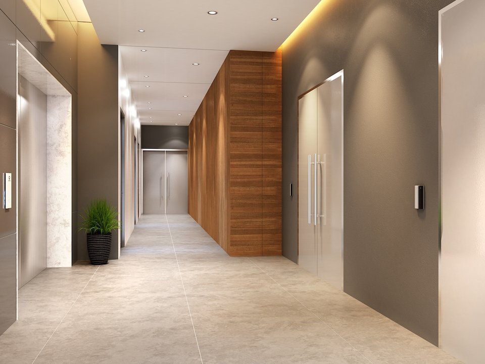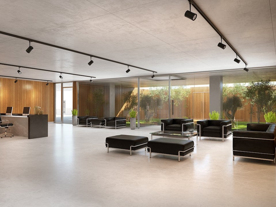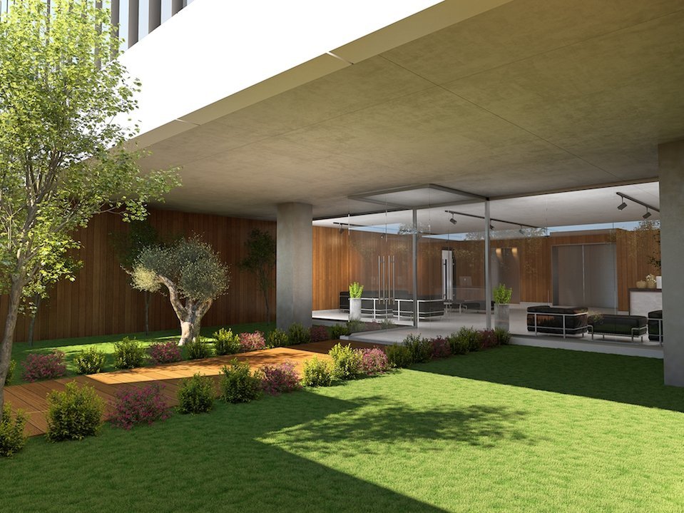 Luxurious lobby entrance formed through an enclosed landscaped garden.