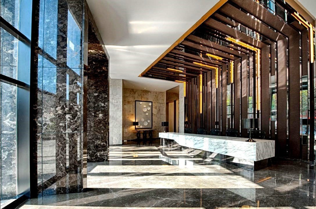 Spacious lobby with custom interior design and ceiling height of more than 7 m